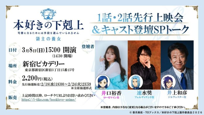 An advance screening of the TV anime Ascendance of a Bookworm: Adopted Daughter of an Archduke will take place at Shinjuku Piccadilly in Tokyo starting at 3:00 PM on March 8. Event details have now been announced.