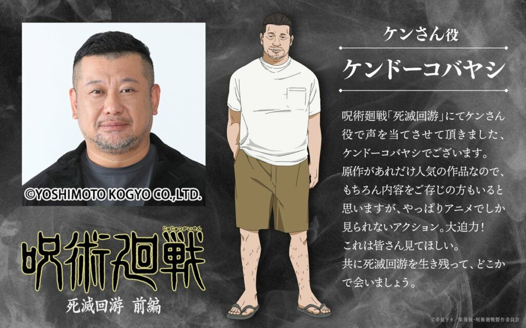 In the Culling Game arc of JUJUTSU KAISEN, Ken-san, japanese comedian who is a senior to the washed up Fumihiko Takaba. The character is inspired by real-life comedian Kendo Kobayashi, who also lends his voice to Ken-san in the anime adaptation.