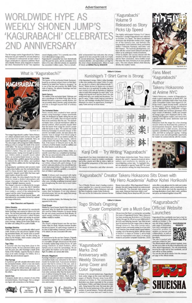 The manga’s official website, launched on October 3, also revealed a version of the page without Chihiro, highlighting a mock newspaper filled with Kagurabachi-themed articles. Among them are features on the cover and color spread from Weekly Shonen Jump’s Issue #45 and other tributes to the series.