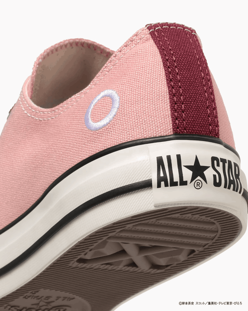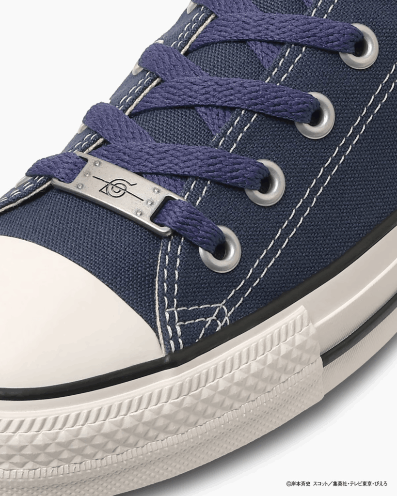 The sneakers worn by Naruto, Sasuke, Sakura, and Kakashi are inspired by the ALL STAR OX silhouette. The upper heel features embroidered motifs representing each character. The shoelace dubrae is designed with the emblem of the Hidden Leaf Village, while the Sasuke edition uniquely showcases the scratched version of the village symbol.