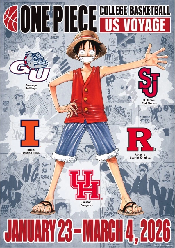 A new multi-team event called the ONE PIECE College Basketball US Voyage will bring Eiichiro Oda’s famous anime series to U.S. college hoops. The tour will feature 15 games and five college teams: Rutgers, Gonzaga, St. John’s, Houston, and Illinois. It begins on January 23 at Rutgers when Indiana visits, and ends on March 4 with Houston facing Baylor.