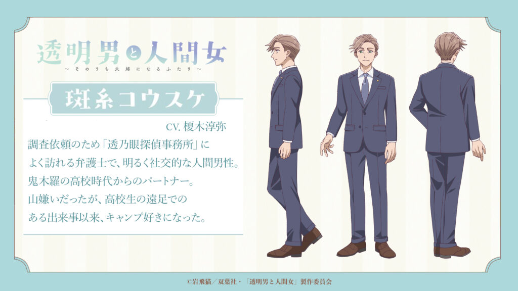 The second promotional video for the TV anime The Invisible Man and His Soon-to-Be Wife, based on the original work by IWATOBINEKO, has been released. The anime has also announced new cast members. The series is scheduled to begin broadcasting on January 8. Crunchyroll will stream the anime worldwide as it airs in Japan.