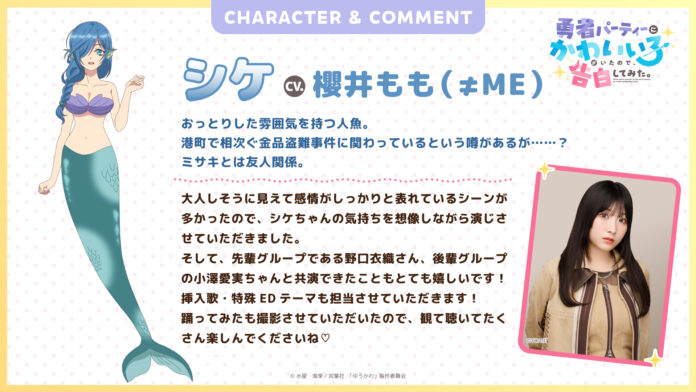 Two additional cast members have been announced for the TV anime There Was a Cute Girl in the Hero’s Party, So I Tried Confessing to Her. Momo Sakurai (≠ME) will voice the mermaid Shike, while Aimi Ozawa (≒JOY) has been cast as Misaki, Shike’s close friend and fellow mermaid.